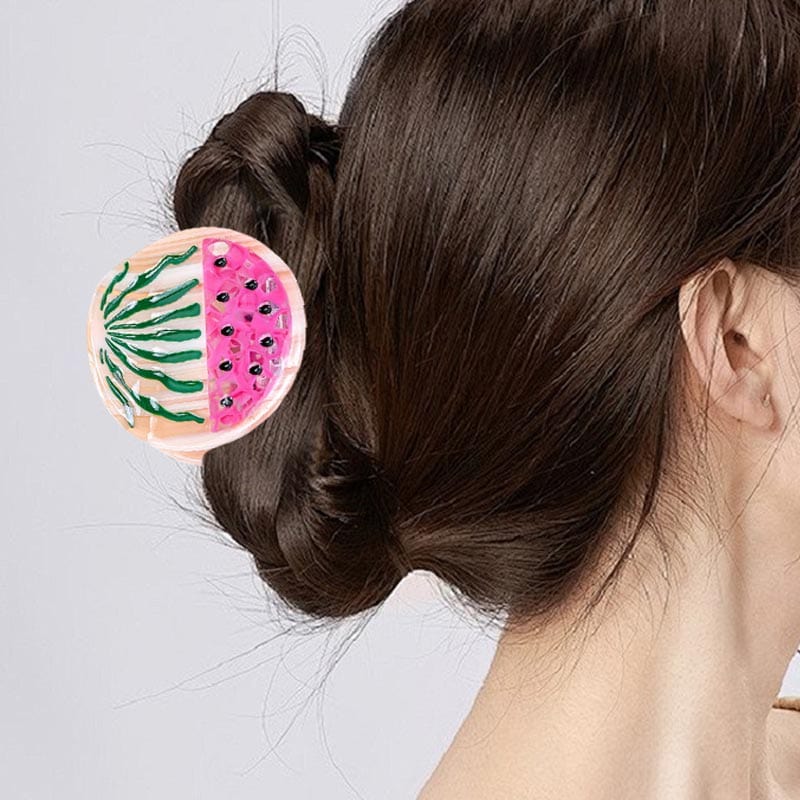 Fruit Series Hair Claw The Fruit Series Hair Claw is a vibrant and fun way to style your hair with a burst of color. Designed with playful fruit-inspired motifs, this hair claw features bright, eye-catching fruit designs that add a touch of summer to any look.